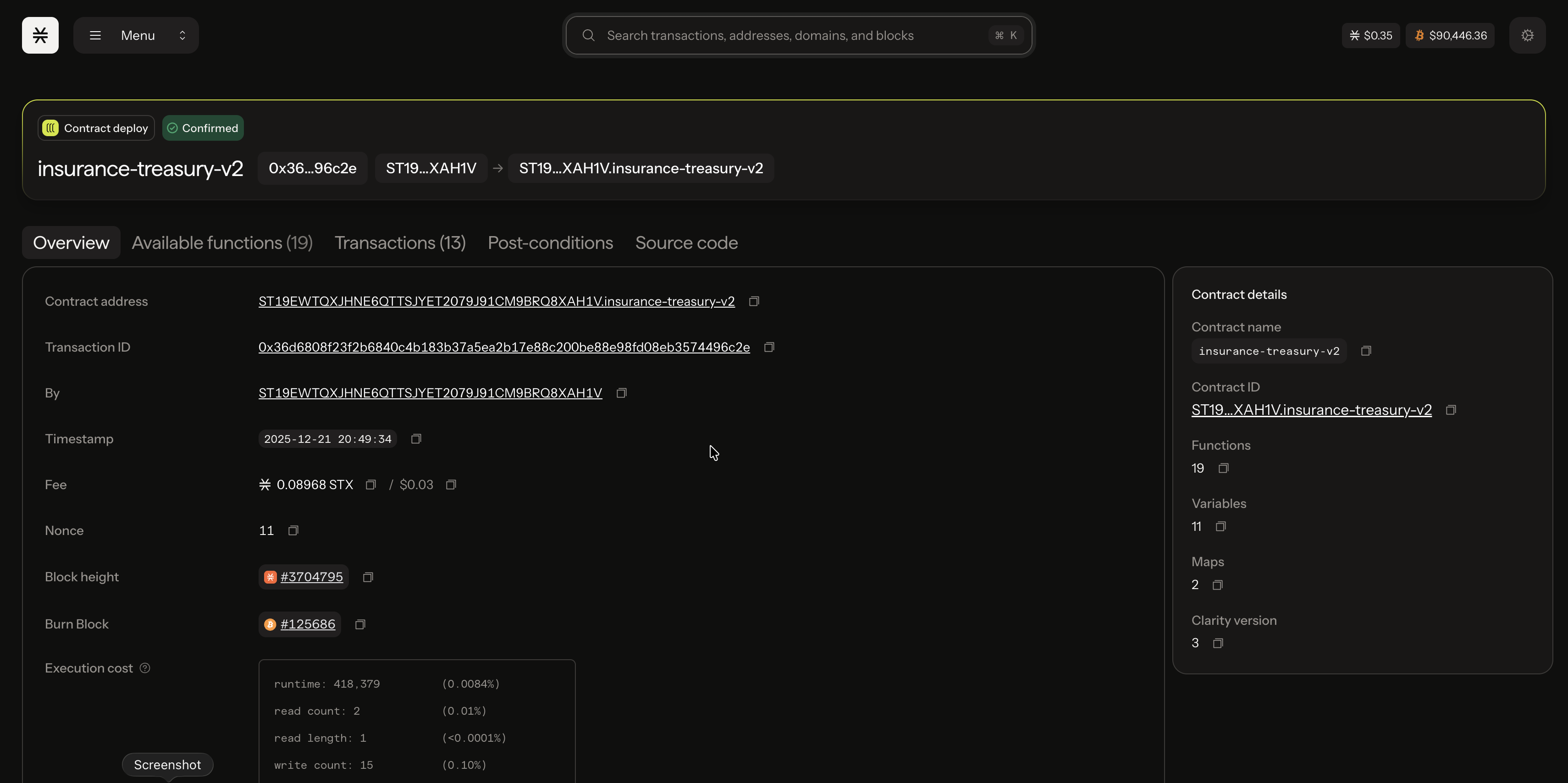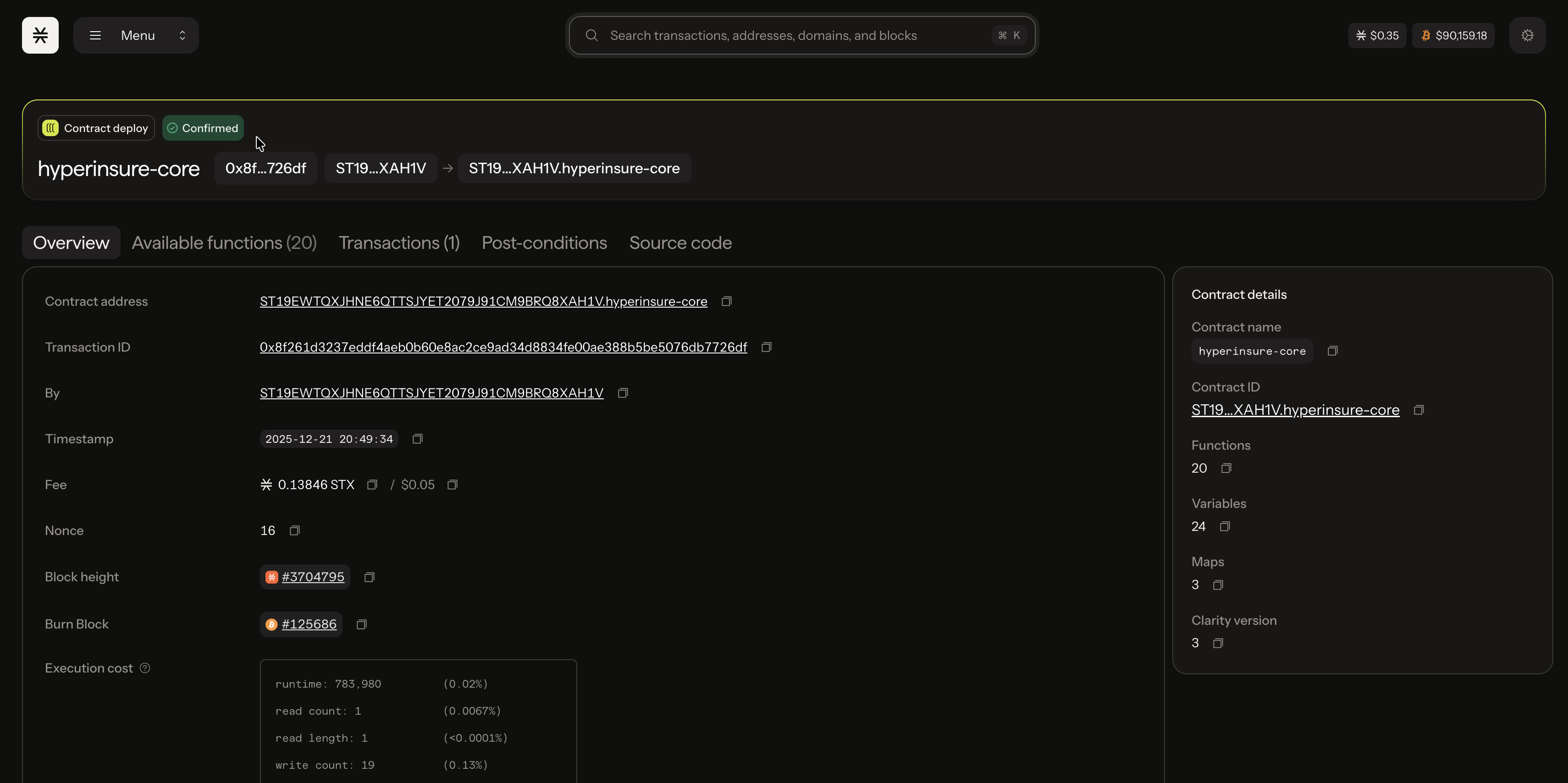 HyperInsure is built on Stacks blockchain with Clarity smart contracts for deterministic, auditable insurance logic; Bitcoin burn block heights for objective time measurement; Bitcoin transaction verification using merkle proofs and block headers; and STX reserves in a decentralized treasury for instant payouts. All verification happens on-chain without requiring trust in centralized parties.