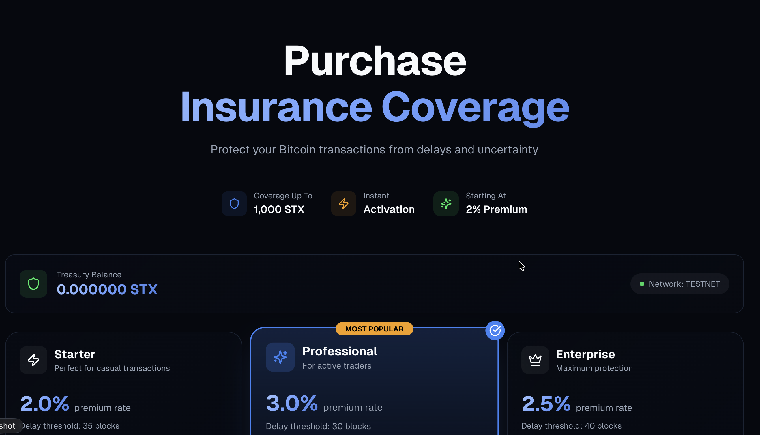 Users purchase insurance coverage using Stacks (STX) tokens for transaction delay protection.